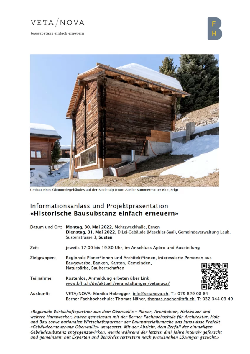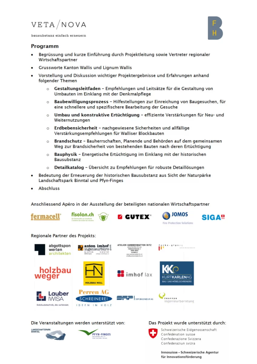 Vor diesem Hintergrund haben regionale Wirtschaftspartner aus dem Oberwallis – Planer, Architekten, Holzbauer und weitere Handwerker – gemeinsam mit der Berner Fachhochschule für Architektur, Holz und Bau sowie nationalen Wirtschaftspartner der Baumaterialbranche das Innosuisse-Projekt «Gebäudeerneuerung Oberwallis» umgesetzt. Mit der Absicht, dem Zerfall der einmaligen Gebäudesubstanz entgegenzuwirken und den Dorfkernen neues Leben einzuhauchen, wurde während der letzten drei Jahre intensiv geforscht, experimentiert und gemeinsam mit Experten und Behördenvertretern nach praxisnahen Lösungen gesucht.