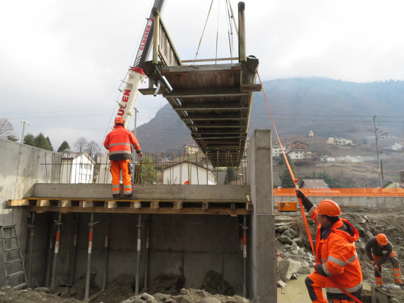 Wie der WalliserBote am 18. Februar 2021 berichtete, wurde am gestrigen Mittwoch die Fussgängerbrücke im Chatzuhüs, welche die "Inselti" mit dem rechten Vispaufer verbindet, angehoben. Dieser Hubvorgang war nötig, um die Brücke entsprechend der hochwassertechnischen Randbedingungen neu positionieren zu können.